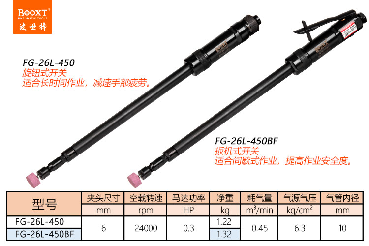 東莞市強(qiáng)勁五金工具有限公司提供臺(tái)灣BOOXT波世特品牌氣動(dòng)工具,氣動(dòng)加長(zhǎng)內(nèi)孔打磨機(jī)FG-26L-450廠家直銷,首件享特價(jià)。咨詢熱線:4008301980