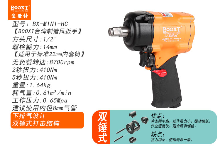東莞市強勁五金工具有限公司提供臺灣BOOXT波世特品牌氣動工具,輕型氣動扳手BX-MINI-HC廠家直銷,首件享特價。咨詢熱線:4008301980