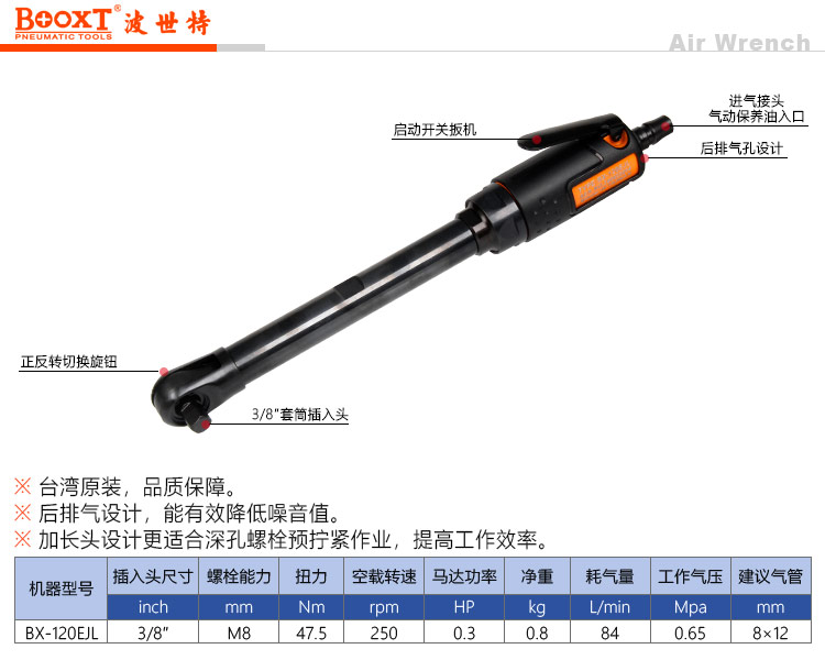 東莞市強勁五金工具有限公司提供臺灣BOOXT波世特品牌氣動工具,加長氣動棘輪扳手BX-120EJL廠家直銷,首件享特價。咨詢熱線:4008301980